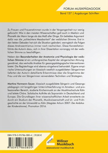 Zu Frauen und Frauenstimmen wurde in der Vergangenheit nur wenig geforscht: Wie in den meisten Wissenschaften galt auch in Medizin und Phonetik der Mann lange als das Maß aller Dinge. Ein beliebtes Argument dafür war die "schlechtere Messbarkeit" der weiblichen Stimme. Erst in den letzten Dekaden hat sich die Situation geändert, wenngleich die Folgen dieses Androzentrismus immer noch nachwirken. Diese Konstellation führte die Autorin dazu, sich in ihrer Dissertation vorrangig mit der weiblichen Stimme zu beschäftigen.Neben den Besonderheiten der Anatomie und Physiologie der weiblichen Stimme ist ein umfangreiches Kapitel der sängerischen Atmung gewidmet, das wertvolle Ansätze für gesangspädagogische Interventionen bietet. Die Registerfrage wird ebenso eingehend behandelt. Eigene empirische Untersuchungen an klassisch-westlich ausgebildeten Sängerinnen lieferten der Autorin detaillierte Erkenntnisse über die Singstimme der Frau und die von Sängerinnen verwendeten Techniken und Strategien.