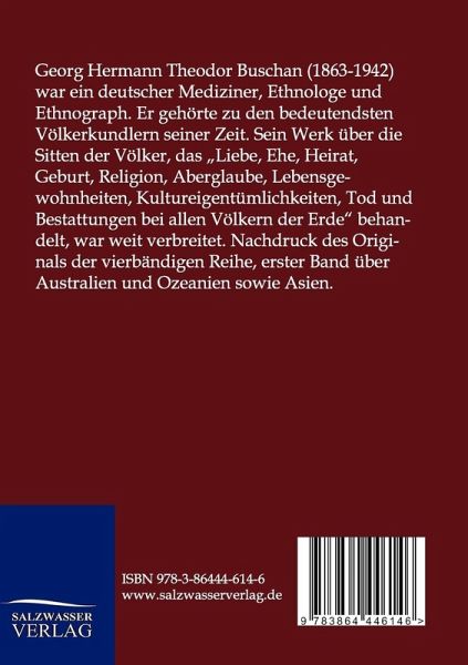 Georg Hermann Theodor Buschan (1863-1942) war ein deutscher Mediziner, Ethnologe und Ethnograph. Er gehörte zu den bedeutendsten Völkerkundlern seiner Zeit. Sein Werk über die Sitten der Völker, das Liebe, Ehe, Heirat, Geburt, Religion, Aberglaube, Lebensgewohnheiten, Kultureigentümlichkeiten, Tod und Bestattungen bei allen Völkern der Erde behandelt, war weit verbreitet. Nachdruck des Originals der vierbändigen Reihe, erster Band über Australien und Ozeanien sowie Asien.