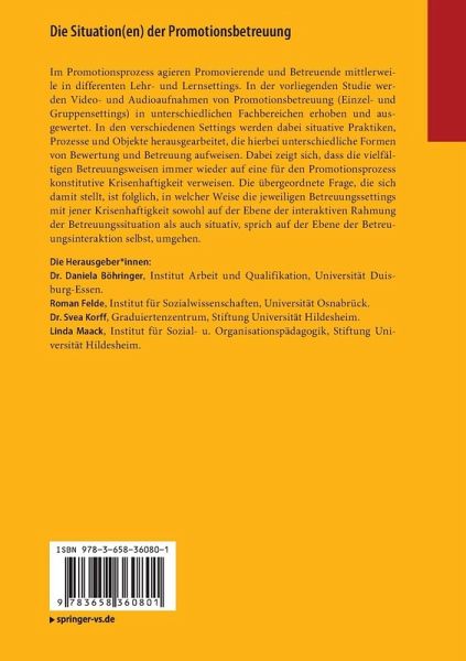 Im Promotionsprozess agieren Promovierende und Betreuende mittlerweile in differenten Lehr- und Lernsettings. In der vorliegenden Studie werden Video- und Audioaufnahmen von Promotionsbetreuung (Einzel- und Gruppensettings) in unterschiedlichen Fachbereichen erhoben und ausgewertet. In den verschiedenen Settings werden dabei situative Praktiken, Prozesse und Objekte herausgearbeitet, die hierbei unterschiedliche Formen von Bewertung und Betreuung aufweisen. Dabei zeigt sich, dass die vielfältigen Betreuungsweisen immer wieder auf eine für den Promotionsprozess konstitutive Krisenhaftigkeit verweisen. Die übergeordnete Frage, die sich damit stellt, ist folglich, in welcher Weise die jeweiligen Betreuungssettings mit jener Krisenhaftigkeit sowohl auf der Ebene der interaktiven Rahmung der Betreuungssituation als auch situativ, sprich auf der Ebene der Betreuungsinteraktion selbst, umgehen.