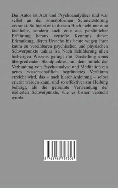 Der Autor ist Arzt und Psychoanalytiker und war selbst an der somatoformen Schmerzstörung erkrankt. So bietet er in diesem Buch nicht nur eine fachliche, sondern auch eine aus persönlicher Erfahrung heraus vertiefte Kenntnis dieser Krankheit, deren Ursache bis heute wegen ihrer kaum zu vereinbaren psychischen und physischen Schwerpunkte unklar ist. Nach Schilderung allen bisherigen Wissens gelingt die Darstellung eines übergreifenden Standpunktes, der mittels der Verbindung von Psychoanalyse und Meditation ein neues, wissenschaftlich begründetes Verfahren erreicht, das - nach klarer Anleitung - aus diesem Buch heraus selbst erlernt werden kann.