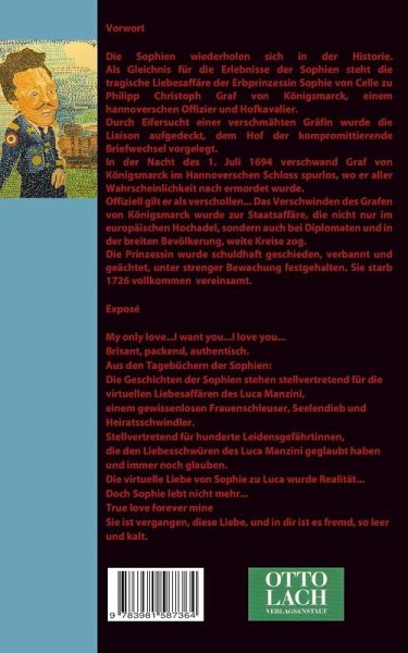 Die Sophienmorde Liebesfalle Internet Vorwort Die Sophien wiederholen sich in der Historie. Als Gleichnis für die Erlebnisse der Sophien steht die tragische Liebesaffäre der Erbprin-zessin Sophia von Celle zu Philipp Christoph Graf von Königs-marck, einem hannoverschen Offizier und Hofkavalier. Durch Eifersucht einer verschmähten Gräfin wurde die Liaison aufgedeckt, dem Hof der kompromittierende Briefwechsel vorge-legt. In der Nacht des 1. Juli 1694 verschwand Graf von Königsmarck im Hannoverschen Schloss spurlos, wo er aller Wahrscheinlichkeit nach ermordet wurde. Offiziell gilt er als verschollen... Das Verschwinden des Grafen von Königsmarck wurde zur Staatsaffäre, die nicht nur im europäischen Hochadel, sondern auch bei Diplomaten und in der breiten Bevöl-kerung, weite Kreise zog. Die Prinzessin wurde schuldhaft geschieden, verbannt und geächtet, unter strenger Bewachung festgehalten. Sie starb 1726 vollkommen vereinsamt. Exposé My only love...I want you...I love you... Brisant, packend, authentisch. Aus den Tagebüchern der Sophien: Die Geschichten der Sophien stehen stellvertretend für die virtuel-len Liebesaffären des Luca Manzini, einem gewissenlosen Frau-enschleuser, Seelendieb und Heiratsschwindler. Stellvertretend für hunderte Leidensgefährtinnen, die den Liebesschwüren des Luca Manzini geglaubt haben und immer noch glauben. Die virtuelle Liebe von Sophie zu Luca wurde Realität... Denn Sophie lebt nicht mehr... True love forever mine Sie ist vergangen, diese Liebe, und in dir ist es fremd, so leer und kalt.
