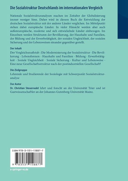 Nationale Sozialstrukturanalysen machen im Zeitalter der Globalisierung immer weniger Sinn. Daher wird in diesem Buch die Entwicklung der deutschen Sozialstruktur mit der anderer Länder verglichen. Im Mittelpunkt stehen dabei europäische Länder. In vieler Hinsicht werden aber auch außereuropäische, moderne und sich entwickelnde Länder einbezogen. Im Einzelnen werden Strukturen der Bevölkerung, der Haushalte und Familien, der Bildung und der Erwerbstätigkeit, der sozialen Ungleichheit, der sozialen Sicherung und der Lebensweisen einander gegenüber gestellt.