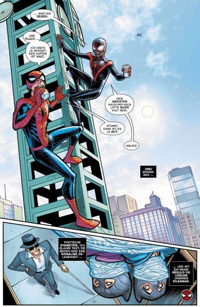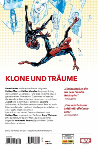 KLONE UND TRÄUME Peter Parker ist der erwachsene, originale Spider-Man und Miles Morales der junge Spidey der nächsten Generation - und dies sind ihre neuen gemeinsamen Abenteuer! Zusammen müssen es die Wandkrabbler mit einem besonders monströsen Jackal und einem Rudel geklonter Vermins aufnehmen. Außerdem werden sowohl Pete als auch Miles von Feinden bedroht, die das perfekte Leben zu einer Waffe machen können. Der Auftakt der neuen Team-up-Serie mit den Spider-Men, inszeniert von TV-Autor Greg Weisman (The Spectacular Spider-Man), Spidey-Zeichner- Legende Humberto Ramos (Spider-Man: Spider- Island) und anderen.ENTHÄLT: WEB OF SPIDER-MAN (2024) 1 (VII) & SPECTACULAR SPIDER-MEN (2024) 1-5