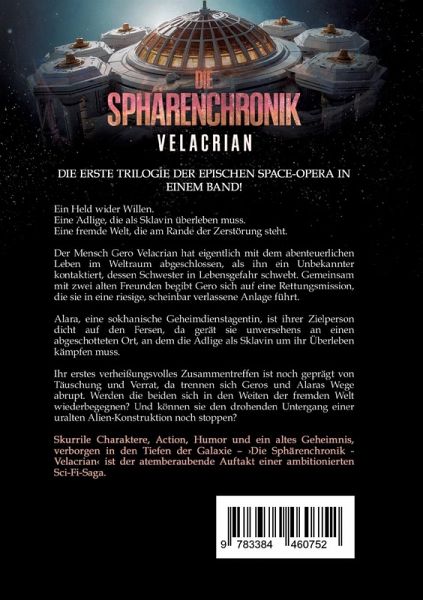 Ein Held wider Willen.Eine Adlige, die als Sklavin überleben muss.Eine fremde Welt, die am Rande der Zerstörung steht.Der Mensch Gero Velacrian hat eigentlich mit dem abenteuerlichen Leben im Weltraum abgeschlossen, als ihn ein Unbekannter kontaktiert, dessen Schwester in Lebensgefahr schwebt. Gemeinsam mit zwei alten Freunden begibt Gero sich auf eine Rettungsmission, die sie in eine riesige, scheinbar verlassene Anlage führt.Alara, eine sokhanische Geheimdienstagentin, ist ihrer Zielperson dicht auf den Fersen, da gerät sie unversehens an einen abgeschotteten Ort, an dem die Adlige als Sklavin um ihr Überleben kämpfen muss.Ihr erstes verheißungsvolles Zusammentreffen ist noch geprägt von Täuschung und Verrat, da trennen sich Geros und Alaras Wege abrupt. Werden sich die beiden in den Weiten der fremden Welt wiederbegegnen? Und können sie den drohenden Untergang einer uralten Alien-Konstruktion noch stoppen?Skurrile Charaktere, Action, Humor und ein altes Geheimnis, verborgen inden tiefen der Galaxie - 'Die Sphärenchronik - Velacrian' ist der atemberaubende Auftakt einer ambitionierten Sci-Fi-Saga.