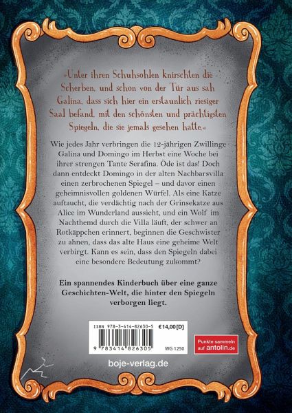 »Unter ihren Schuhsohlen knirschten die Scherben, und schon von der Tür aus sah Galina, dass sich hier ein erstaunlich riesiger Saal befand, mit den schönsten und prächtigsten Spiegeln, die sie jemals gesehen hatte.«Wie jedes Jahr verbringen die 12-jährigen Zwillinge Galina und Domingo im Herbst eine Woche bei ihrer strengen Tante Serafina. Öde ist das! Doch dann entdeckt Domingo in der alten Nachbarsvilla einen zerbrochenen Spiegel - und davor einen geheimnisvollen goldenen Würfel. Als eine Katze auftaucht, die verdächtig nach der Grinsekatze aus Alice im Wunderland aussieht und ein Wolf im Nachthemd durch die Villa läuft, der schwer an Rotkäppchen erinnert, beginnen die Geschwister zu ahnen, dass das alte Haus eine geheime Welt verbirgt. Kann es sein, dass den Spiegeln dabei eine besondere Bedeutung zukommt? Ein spannendes Kinderbuch über eine ganze Geschichten-Welt, die hinter den Spiegeln verborgen liegt.