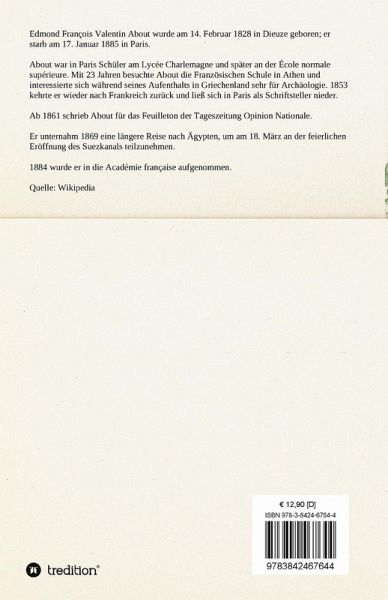 Edmond François Valentin About wurde am 14. Februar 1828 in Dieuze geboren; er starb am 17. Januar 1885 in Paris.About war in Paris Schüler am Lycée Charlemagne und später an der École normale supérieure. Mit 23 Jahren besuchte About die Französischen Schule in Athen und interessierte sich während seines Aufenthalts in Griechenland sehr für Archäologie. 1853 kehrte er wieder nach Frankreich zurück und ließ sich in Paris als Schriftsteller nieder.Ab 1861 schrieb About für das Feuilleton der Tageszeitung Opinion Nationale.Er unternahm 1869 eine längere Reise nach Ägypten, um am 18. März an der feierlichen Eröffnung des Suezkanals teilzunehmen.1884 wurde er in die Académie française aufgenommen.Quelle: Wikipedia