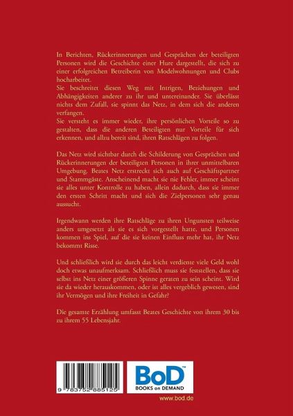 In Berichten, Rückerinnerungen und Gesprächen der beteiligten Personen wird die Geschichte einer Hure dargestellt, die sich zu einer erfolgreichen Betreiberin von Modelwohnungen und Clubs hocharbeitet. Sie beschreitet diesen Weg mit Intrigen, Beziehungen und Abhängigkeiten anderer zu ihr und untereinander. Sie überlässt nichts dem Zufall, sie spinnt das Netz, in dem sich die anderen verfangen.Sie versteht es immer wieder, ihre persönlichen Vorteile so zu gestalten, dass die anderen Beteiligten nur Vorteile für sich erkennen und allzu bereit sind, ihren Ratschlägen zu folgen.Das Netz wird sichtbar durch die Schilderung von Gesprächen und Rückerinnerungen der beteiligten Personen in ihrer unmittelbaren Umgebung. Beates Netz erstreckt sich auch auf Geschäftspartner und Stammgäste. Anscheinend macht sie nie Fehler, immer scheint sie alles unter Kontrolle zu haben, allein dadurch, dass sie immer den ersten Schritt macht und sich die Zielpersonen sehr genau aussucht.Irgendwann werden ihre Ratschläge zu ihren Ungunsten teilweise anders umgesetzt als sie es sich vorgestellt hatte, und Personen kommen ins Spiel, auf die sie keinen Einfluss mehr hat, ihr Netz bekommt Risse.Und schließlich wird sie durch das leicht verdiente viele Geld wohl doch etwas unaufmerksam. Schließlich muss sie feststellen, dass sie selbst ins Netz einer größeren Spinne geraten zu sein scheint. Wird sie da wieder herauskommen, oder ist alles vergeblich gewesen, sind ihr Vermögen und ihre Freiheit in Gefahr?Die gesamte Erzählung umfasst Beates Geschichte von ihrem 30. bis zu ihrem 55. Lebensjahr.