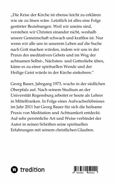 Der Name Georg Bauer ist mein Pseudonym als Autor. Geboren wurde ich 1973 in Regensburg. Aufgewachsen bin ich in der südlichen Oberpfalz. Nach meinem Studium an der Universität Regensburg arbeite ich heute als Lehrer in Mittelfranken. Seit meiner Kindheit litt ich - ohne mir dessen bewusst zu sein - an einer schweren Angststörung, die mit Zwängen und Depressionen einherging. Nach einem persönlichen Aufwacherlebnis im Jahr 2011, habe ich für mich den heilsamen Weg von Meditation und Achtsamkeit entdeckt. Durch die Kraft des achtsamen Atmens ist es mir mittlerweile gelungen, meine psychische Gesundheit weitgehend in den Griff zu bekommen. In meinen Büchern ist es mir ein Anliegen, freimütig über meine psychische Leidens- und Heilungsgeschichte ebenso wie über meine spirituellen und religiösen Erfahrungen zu schreiben. Dabei möchte ich meinen Leserinnen und Lesern tiefe Einblicke in meine Gedankenwelt gewähren. Besonders wichtig ist es mir, anderen Menschen, die ebenfalls unter psychischen Störungen leiden, Mut zu machen und Wege der Heilung aufzuzeigen. Da sich diese große Nähe und Offenheit schlecht mit meiner Stellung als Lehrer verträgt, habe ich das Pseudonym Georg Bauer gewählt. Der spirituelle Weg von Meditation und Achtsamkeit ist für mich mittlerweile zum Lebensweg geworden. Als gläubiger Christ mit römisch-katholischem Bekenntnis möchte ich meine spirituellen Praktiken dabei stets vor dem Hintergrund meines christlichen Glaubens darstellen. Meine Texte richten sich aber nicht ausschließlich an religiöse Menschen. Meditation und Achtsamkeit sind für mich universelle spirituelle Praktiken, die an keine Religion oder Weltanschauung gebunden sind. Grundsätzlich möchte ich meine Leserinnen und Leser ganz praktisch, lebensnah und anschaulich dazu einladen, die eigene Spiritualität zu entdecken, um so zufriedener und glücklicher leben zu können.