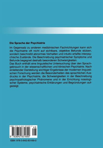 Im Gegensatz zu anderen medizinischen Fachrichtungen kann sich die Psychiatrie oft nicht auf sichtbare, objektive Befunde stützen, sondern beschreibt abnormes Verhalten und intuitiv erfasste interpsychische Zustände. Die Beschreibung psychiatrischer Symptome und Befunde begegnet deshalb besonderen Schwierigkeiten. Das Buch enthält eine linguistische Untersuchung über den Sprachgebrauch in der wissenschaftlichen und klinischen Psychiatrie. Nach einleitender Darstellung wichtiger Ergebnisse der modernen linguistischen Forschung werden die Besonderheiten des sprachlichen Ausdrucks in der Psychiatrie, die Schwierigkeiten in der Beschreibung psychopathologischer Phänomene und in der Errichtung nosologischer Systeme, psychiatrische Erklärungen und Begründungen aufgezeigt.