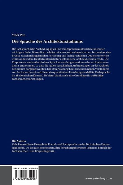 Die fachsprachliche Ausbildung spielt im Fremdsprachenunterricht eine immer wichtigere Rolle. Dieses Buch schlägt mit einer korpuslinguistischen Textanalyse eine Brücke zwischen linguistischer Forschung und fachsprachlichen Deutschunterricht - insbesondere dem Deutschunterricht für ausländische Architekturstudierende. Die Korpustexte sind authentischen Sprachanwendungssituationen des Architekturstudiums entnommen, so dass die realen sprachlichen Anforderungen an das Architekturstudium dargelegt werden. Die Untersuchung baut auf einem neuen Verständnis von Fachsprache auf und bietet ein quantitatives Forschungsmodell für Fachsprache im akademischen Kontext. Sie bietet damit auch eine Grundlage für zukünftige Fachsprachenforschungen.
