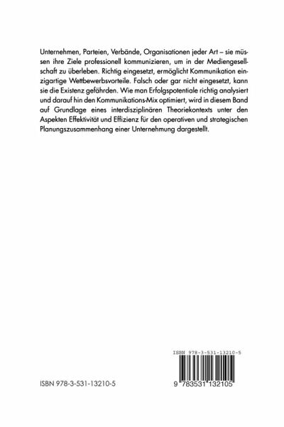 Unternehmen, Parteien, Verbände, Organisationen jeder Art - sie müssen ihre Ziele professionell kommunizieren, um in der Mediengesellschaft zu überleben. Richtig eingesetzt, ermöglicht Kommunikation einzigartige Wettbewerbsvorteile. Falsch oder gar nicht eingesetzt, kann sie die Existenz gefährden. Wie man Erfolgspotentiale richtig analysiert und darauf hin den Kommunikations-Mix optimiert, wird in diesem Band auf Grundlage eines interdisziplinären Theoriekontexts unter den Aspekten Effektivität und Effizienz für den operativen und strategischen Planungszusammenhang einer Unternehmung dargestellt.