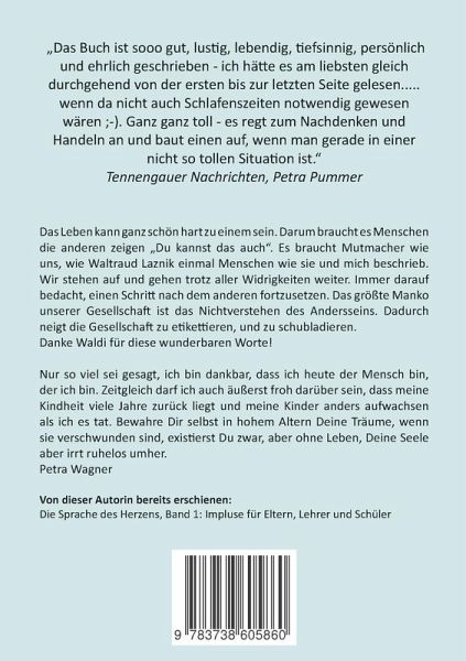 >> Das Buch ist sooo gut, lustig, lebendig, tiefsinnig, persönlich und ehrlich geschrieben - ich hätte es am liebsten gleich durchgehend von der ersten bis zur letzten Seite gelesen..... wenn da nicht auch Schlafenszeiten notwendig gewesen wären. Ganz ganz toll - es regt zum Nachdenken und Handeln an und baut einen auf, wenn man gerade in einer nicht so tollen Situation ist. Petra Pummer, Redaktionsassistenz - Tennengauer Nachrichten <<>> Das Leben kann ganz schön hart zu einem sein. Darum braucht es Menschen die anderen zeigen "Du kannst das auch". Es braucht Mutmacher wie uns, wie Waltraud Laznik einmal Menschen wie sie und mich beschrieb. Wir stehen auf und gehen trotz aller Widrigkeiten weiter.Immer darauf bedacht, einen Schritt nach dem anderen fortzusetzen. Das größte Manko unserer Gesellschaft ist das Nichtverstehen des Andersseins. Dadurch neigt die Gesellschaft zu etikettieren, und zu schubladieren. << Waltraud Laznik >> Nur so viel sei gesagt, ich bin dankbar, dass ichheute der Mensch bin, der ich bin. Zeitgleich darf ich auch äußerst froh darüber sein, dass meine Kindheit viele Jahre zurück liegt und meine Kinder anders aufwachsen als ich es tat. Bewahre Dir selbst in hohem Altern Deine Träume, wenn sie verschwunden sind, existierst Du zwar, jedoch ohne Leben, Deine Seele aber irrt ruhelos umher. << Petra Wagner