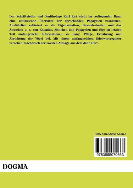 Der Schriftsteller und Ornithologe Karl Ruß stellt im vorliegenden Band eine umfassende Übersicht der sprechenden Papageien zusammen. Ausführlich erläutert er die Eigenschaften, Besonderheiten und das Aussehen u. a. von Kakadus, Sittichen und Papageien und fügt im letzten Teil umfangreiche Informationen zu Fang, Pflege, Ernährung und Abrichtung der Vögel bei. Mit einem umfangreichen Stichwortregister versehen. Nachdruck der zweiten Auflage aus dem Jahr 1887.