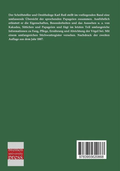 Der Schriftsteller und Ornithologe Karl Ruß stellt im vorliegenden Band eine umfassende Übersicht der sprechenden Papageien zusammen. Ausführlich erläutert er die Eigenschaften, Besonderheiten und das Aussehen u. a. von Kakadus, Sittichen und Papageien und fügt im letzten Teil umfangreiche Informationen zu Fang, Pflege, Ernährung und Abrichtung der Vögel bei. Mit einem umfangreichen Stichwortregister versehen. Nachdruck der zweiten Auflage aus dem Jahr 1887.