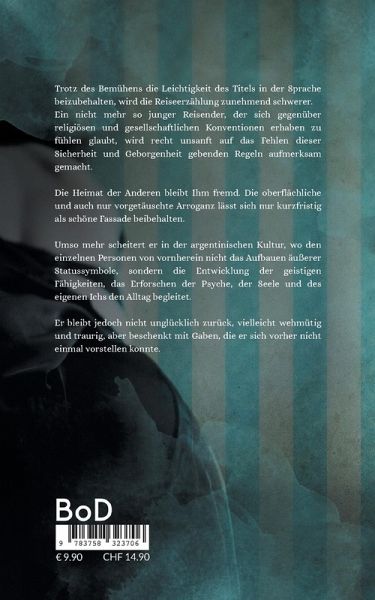 Trotz des Bemühens die Leichtigkeit des Titels in der Sprache beizubehalten, wird die Reiseerzählung zunehmend schwerer.Ein nicht mehr so junger Reisender, der sich gegenüber religiösen und gesellschaftlichen Konventionen erhaben zu fühlen glaubt, wird recht unsanft auf das Fehlen dieser Sicherheit und Geborgenheit gebenden Regeln aufmerksam gemacht.Die Heimat der Anderen bleibt Ihm fremd. Die oberflächliche und auch nur vorgetäuschte Arroganz lässt sich nur kurzfristig als schöne Fassade beibehalten. Umso mehr scheitert er in der argentinischen Kultur, wo den einzelnen Personen von vornherein nicht das Aufbauen äußerer Statussymbole, sondern die Entwicklung der geistigen Fähigkeiten, das Erforschen der Psyche, der Seele und des eigenen Ichs den Alltag begleitet.Er bleibt jedoch nicht unglücklich zurück, vielleicht wehmütig und traurig, aber beschenkt mit Gaben, die er sich vorher nicht einmal vorstellen konnte.