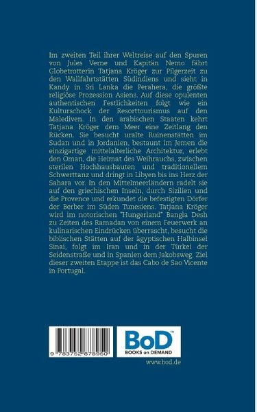Im zweiten Teil ihrer Weltreise auf den Spuren von Jules Verne und Kapitän Nemo fährt Globetrotterin Tatjana Kröger zur Pilgerzeit zu den Wallfahrtstätten Südindiens und sieht in Kandy in Sri Lanka die Perahera, die größte religiöse Prozession Asiens. Auf diese opulenten authentischen Festlichkeiten folgt wie ein Kulturschock der Resorttourismus auf den Malediven. In den arabischen Staaten kehrt Tatjana Kröger dem Meer eine Zeitlang den Rücken. Sie besucht uralte Ruinenstätten im Sudan und in Jordanien, bestaunt im Jemen die einzigartige mittelalterliche Architektur, erlebt den Oman, die Heimat des Weihrauchs, zwischen sterilen Hochhausbauten und traditionellem Schwerttanz und dringt in Libyen bis ins Herz der Sahara vor. In den Mittelmeerländern radelt sie auf den griechischen Inseln, durch Sizilien und die Provence und erkundet die befestigten Dörfer der Berber im Süden Tunesiens. Tatjana Kröger wird im notorischen "Hungerland" Bangla Desh zu Zeiten des Ramadan von einem Feuerwerk an kulinarischen Eindrücken überrascht, besucht die biblischen Stätten auf der ägyptischen Halbinsel Sinai, folgt im Iran und in der Türkei der Seidenstraße und in Spanien dem Jakobsweg. Ziel dieser zweiten Etappe ist das Cabo de Sao Vicente in Portugal.