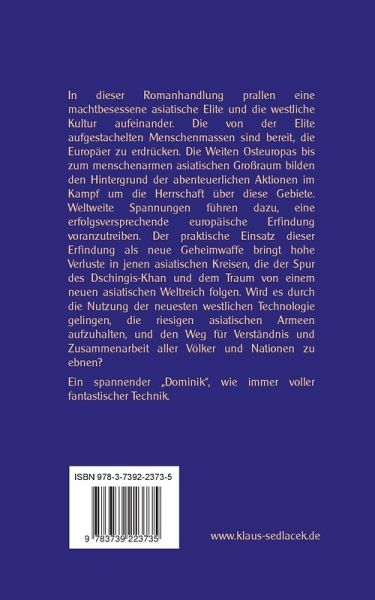 In dieser Romanhandlung prallen eine machtbesessene asiatische Elite und die westliche Kultur aufeinander. Die von der Elite aufgestachelten Menschenmassen sind bereit, die Europäer zu erdrücken. Die Weiten Osteuropas bis zum menschenarmen asiatischen Großraum bilden den Hintergrund der abenteuerlichen Aktionen im Kampf um die Herrschaft über diese Gebiete. Weltweite Spannungen führen dazu, eine erfolgsversprechende europäische Erfindung voranzutreiben. Der praktische Einsatz dieser Erfindung als neue Geheimwaffe bringt hohe Verluste in jenen asiatischen Kreisen, die der Spur des Dschingis-Khan und dem Traum von einem neuen asiatischen Weltreich folgen. Wird es durch die Nutzung der neuesten westlichen Technologie gelingen, die riesigen asiatischen Armeen aufzuhalten, und den Weg für Verständnis und Zusammenarbeit aller Völker und Nationen zu ebnen?Ein spannender "Dominik", wie immer voller fantastischer Technik.