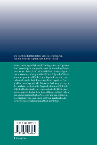 Immer mehr Jugendliche und Kinder greifen zur Zigarette. Die Gesetzeslage sowie gesellschaftliche Kontrollmechanismen haben diesen Trend nicht aufhalten können. Wegen der schwerwiegenden gesundheitlichen Folgen des Tabakkonsums gerade bei Kindern und Jugendlichen wird zunehmend von der Politik verlangt, dieser negativen Entwicklung durch gesetzliche Reformen Rechnung zu tragen. Der Verfasser stellt sich die Frage, ob dieses von Teilen der Öffentlichkeit artikulierte rechtspolitische Bedürfnis aus verfassungsrechtlicher Sicht Unterstützung erfährt. Neben den verfassungsrechtlichen Vorgaben und der geltenden Gesetzeslage, werden auch die zentralen gesetzlichen Reformvorschläge verfassungsrechtlich gewürdigt.