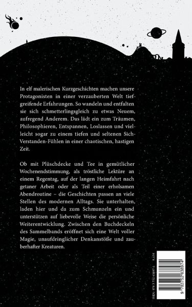 In elf malerischen Kurzgeschichten machen unsere Protagonisten in einer verzauberten Welt tiefgreifende Erfahrungen. So wandeln und entfalten sie sich schmetterlingsgleich zu etwas Neuem, aufregend Anderem. Das lädt ein zum Träumen, Philosophieren, Entspannen, Loslassen und vielleicht sogar zu einem tiefen und seltenen Sich-Verstanden-Fühlen in einer chaotischen, hastigen Zeit.Ob mit Plüschdecke und Tee in gemütlicher Wochenendstimmung, als tröstliche Lektüre an einem Regentag, auf der langen Heimfahrt nach getaner Arbeit oder als Teil einer erholsamen Abendroutine - die Geschichten passen an viele Stellen des modernen Alltags. Sie unterhalten, laden hier und da zum Schmunzeln ein und unterstützen auf liebevolle Weise die persönliche Weiterentwicklung. Zwischen den Buchdeckeln des Sammelbands eröffnet sich eine Welt voller Magie, unaufdringlicher Denkanstöße und zauberhafter Kreaturen.