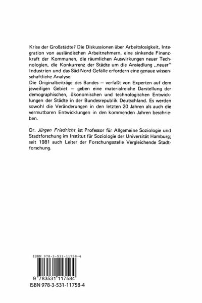 Der Wandel von Stadten ist eng mit dem der Gese11schaft verbunden. Die gegenwartigen Veranderungen der Beschaftigtenstruktur, der demographi schen Struktur, sowie die techno10gischen Veranderungen haben die GroB stadte stark und in unterschied1ichem MaBe getroffen. Arbeits10sigkeit, Umwe1tschutz, neue Hausha1tsformen, hohe Aus1anderantei1e, sinkende Fi nanzkraft und Konkurrenz urn die Ansied1ung von "neuen" Industrien sind Beispie1e dafUr. Dieser Band soll die Veranderungen der GroBstadte in den 1etzten 15-20 Jahren dokumentieren und ana1ysieren. Er soll auBerdem Hinweise auf die abschatzbaren Entwick1ungen bis zum Ende der Dekade geben. Sch1ieB1ich gehen einige Beitrage auf die Frage ein, wie sich die beschriebenen Ent wick1ungen auf die funktiona1e Arbeitstei1ung zwischen den groBten Stad ten auswirken werden. Die feh1ende Vo1kszah1ung 1981/1983 erschwerte die Ana1ysen. Aber gerade desha1b dUrften die materia1reichen Aufsatze von Bedeutung fUr Sozia1wis senschaft1er, Planer undPo1itiker sein. - A11e Beitrage wurden fUr die sen Band geschrieben. Ich danke der British American Tobacco-Stiftung fUr die finanzie11e Un terstUtzung des Projekts, Frau Margrit Menck und Herrn Volker Eng1ich fUr ihre Gedu1d am Textcomputer. Der Herausgeber Jurgen Friedrichs Die Zukunft der Stadte in der Bundesrepublik "Profound changes in the character of the city can only come from the sources from which they have always come, chan economy and technology".