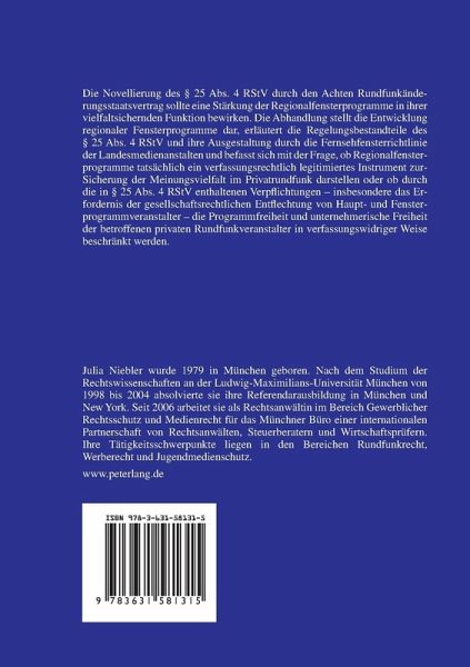 25 Abs. 4 RStV und ihre Ausgestaltung durch die Fernsehfensterrichtlinie der Landesmedienanstalten und befasst sich mit der Frage, ob Regionalfensterprogramme tatsächlich ein verfassungsrechtlich legitimiertes Instrument zur Sicherung der Meinungsvielfalt im Privatrundfunk darstellen oder ob durch die in