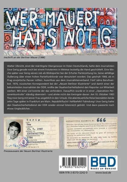 Uwe Gerig gehört zu den wenigen Journalisten seines Jahrganges, die die Auswirkungen der Teilung Deutschlands beruflich in Ost und West verfolgen konnten. Der Autor beschreibt, wie er 1968 wegen einer abfälligen Äußerung über einen DDR-Funktionär denunziert, aus dem Journalistenverband ausgeschlossen und dann mit fünf Jahren Berufsverbot bestraft wurde. Gleichzeitig observierte ihn der Staatssicherheitsdienst durch vier IM (Inoffizielle Mitarbeiter) und legte Akten unter dem Codewort "Reporter" über ihn an. Von dieser Beschattung, der Post-und Telefonkontrolle, ahnte Gerig zwar etwas, doch erst die nach dem Untergang der DDR zugänglichen Dokumente bewiesen das ganze Ausmaß der Bespitzelung. Im Buch werden zahlreiche dieser Dokumente veröffentlicht. 1976 sollte der Journalist, inzwischen arbeitete er als Reporter für die größte Illustrierte der DDR, selbst vom Staatssicherheitsdienst als Spitzel angeworben werden. Mit welcher List er sich diesem Versuch entziehen konnte, beschreibt der Autor sehr ausführlich im Buch. Sieben Jahre später, im Herbst 1983, flüchtete Gerig mit seiner Frau aus der DDR. Der Staatssicherheitsdienst hatte trotz andauernder Beobachtung die Fluchtvorbereitungen nicht bemerkt und reagierte hilflos, wie die von Gerig im Buch veröffentlichten Dokumente beweisen. Dass es ihm mit Bluff und Drohungen gelang, seine erwachsene Tochter innerhalb von drei Monaten nach der eigenen Flucht aus den Fängen des Staatssicherheitsdienstes freizupressen, beschreibt der Autor im Buch nicht ohne Schadenfreude.