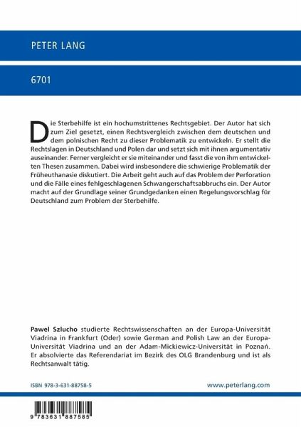 Die Sterbehilfe ist ein hochumstrittenes Rechtsgebiet. Der Autor hat sich zum Ziel gesetzt, einen Rechtsvergleich zwischen dem deutschen und dem polnischen Recht zu dieser Problematik zu entwickeln. Er stellt die Rechtslagen in Deutschland und Polen dar und setzt sich mit ihnen argumentativ auseinander. Ferner vergleicht er sie miteinander und fasst die von ihm entwickelten Thesen zusammen. Dabei wird insbesondere die schwierige Problematik der Früheuthanasie diskutiert. Die Arbeit geht auch auf das Problem der Perforation und die Fälle eines fehlgeschlagenen Schwangerschaftsabbruchs ein. Der Autor macht auf der Grundlage seiner Grundgedanken einen Regelungsvorschlag für Deutschland zum Problem der Sterbehilfe