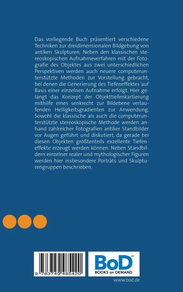 Das vorliegende Buch präsentiert verschiedene Techniken zur dreidimensionalen Bildgebung von antiken Skulpturen. Neben den klassischen stereoskopischen Aufnahmeverfahren mit der Fotografie des Objektes aus zwei unterschiedlichen Perspektiven werden auch neuere computerunterstützte Methoden zur Vorstellung gebracht, bei denen die Generierung des Tiefeneffektes auf Basis einer einzelnen Aufnahme erfolgt. Hier gelangt das Konzept der Objekttiefenkartierung mithilfe eines senkrecht zur Bildebene verlaufenden Helligkeitsgradienten zur Anwendung. Sowohl die klassische als auch die computerunterstützte stereoskopische Methode werden anhand zahlreicher Fotografien antiker Standbilder vor Augen geführt und diskutiert, da gerade bei diesen Objekten größtenteils exzellente Tiefeneffekte erzeugt werden können. Neben Standbildern einzelner realer und mythologischer Figuren werden hier insbesondere Porträts und Skulpturengruppen beschrieben.