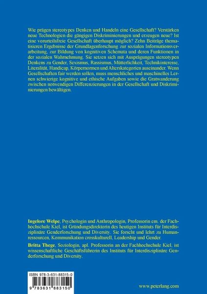 Wie prägen stereotypes Denken und Handeln eine Gesellschaft? Verstärken neue Technologien die gängigen Diskriminierungen und erzeugen neue? Ist eine vorurteilsfreie Gesellschaft überhaupt möglich? Zehn Beiträge thematisieren Ergebnisse der Grundlagenforschung zur sozialen Informationsverarbeitung, zur Bildung von kognitiven Schemata und deren Funktionen in der sozialen Wahrnehmung. Sie setzen sich mit Ausprägungen stereotypen Denkens zu Gender, Sexismus, Rassismus, Mütterlichkeit, Technikinteresse, Literalität, Handicap, Körpernormen und Alterskategorien auseinander. Wenn Gesellschaften fair werden sollen, muss menschliches und maschinelles Lernen schwierige kognitive und ethische Aufgaben sowie die Gratwanderung zwischen notwendigen Differenzierungen in der Gesellschaft und Diskriminierungen bewältigen.