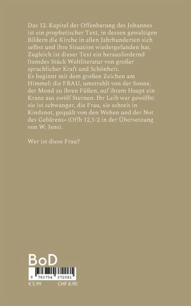 Das 12. Kapitel der Offenbarung des Johannes ist ein prophetischer Text, in dessen gewaltigen Bildern die Kirche in allen Jahrhunderten sich selbst und ihre Situation wiedergefunden hat. Zugleich ist dieser Text ein herausfordernd fremdes Stück Weltliteratur von großer sprachlicher Kraft und Schönheit. Es beginnt mit dem großen Zeichen am Himmel: die FRAU, umstrahlt von der Sonne, der Mond zu ihren Füßen, auf ihrem Haupt ein Kranz aus zwölf Sternen. Ihr Leib war gewölbt: sie ist schwanger, die Frau, sie schreit in Kindsnot, gequält von den Wehen und der Not des Gebärens« (Offb 12,1-2 in der Übersetzung von W. Jens). Wer ist diese Frau?Herausgeber: Hans-Jürgen Sträter, Adlerstein Verlag
