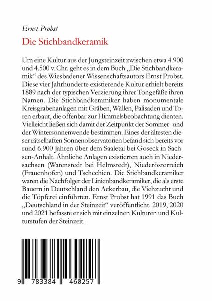 Um eine Kultur aus der Jungsteinzeit zwischen etwa 4.900 und 4.500 v. Chr. geht es in dem Buch "Die Stichbandkeramik" des Wiesbadener Wissenschaftsautors Ernst Probst. Diese vier Jahrhunderte existierende Kultur erhielt bereits 1889 nach der typischen Verzierung ihrer Tongefäße ihren Namen. Die Stichbandkeramiker haben monumentale Kreisgrabenanlagen mit Gräben, Wällen, Palisaden und Toren erbaut, die offenbar zur Himmelsbeobachtung dienten. Offenbar ließen sich damit der Zeitpunkt der Sommer- und der Wintersonnenwende bestimmen. Eines der ältesten dieser rätselhaften Sonnenobservatorien befand sich bereits vor rund 6.900 Jahren über dem Saaletal bei Goseck in Sachsen-Anhalt. Ähnliche Anlagen existierten auch in Niedersachsen (Watenstedt bei Helmstedt), Niederösterreich (Frauenhofen) und Tschechien. Die Stichbandkeramiker waren die Nachfolger der Linienbandkeramiker, die als erste Bauern in Deutschland den Ackerbau, die Viehzucht und die Töpferei einführten. Ernst Probst hat 1991 das Buch "Deutschland in der Steinzeit" veröffentlicht. 2019 befasste er sich mit einzelnen Kulturen und Kulturstufen der Steinzeit.