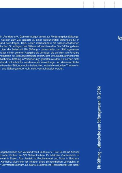 Der Verein «Fundare e.V., Gemeinnütziger Verein zur Förderung des Stiftungswesens» hat sich zum Ziel gesetzt, zu einer aufblühenden Stiftungskultur in Deutschland beizutragen. Dazu sollen insbesondere die wissenschaftlichen und praktischen Grundlagen des Stiftens erforscht werden. Der Erfüllung dieser Aufgabe dient die Zeitschrift «Die Stiftung - Jahreshefte zum Stiftungswesen». Sie beinhaltet in ihrer zehnten Ausgabe die Vorträge, die auf dem von Fundare e.V. veranstalteten «10. Stiftungsrechtstag an der Ruhr-Universität Bochum» unter dem Globalthema «Stiftung in Veränderung» gehalten wurden. Es werden nicht nur eingehend zivilrechtliche, sondern auch verwaltungs- und steuerrechtliche Problematiken des Stiftungsrechts beleuchtet, wobei die aktuellen Themen im Stiftungs- und Stiftungssteuerrecht nicht vernachlässigt werden.