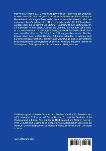 Der Verein «Fundare e.V., Gemeinnütziger Verein zur Förderung des Stiftungswesens» hat sich zum Ziel gesetzt, zu einer aufblühenden Stiftungskultur in Deutschland beizutragen. Dazu sollen insbesondere die wissenschaftlichen und praktischen Grundlagen des Stiftens erforscht werden. Der Erfüllung dieser Aufgabe dient die Zeitschrift «Die Stiftung - Jahreshefte zum Stiftungswesen». Sie beinhaltet in ihrer elften Ausgabe die Vorträge, die auf dem von Fundare e.V. veranstalteten «11. Stiftungsrechtstag an der Ruhr-Universität Bochum» unter dem Globalthema «Die Zukunft der Stiftung» gehalten wurden. Darüber hinaus haben noch weitere Beiträge Aufnahme gefunden. Es werden nicht nur eingehend zivilrechtliche, sondern auch verwaltungs- und steuerrechtliche Problematiken des Stiftungsrechts beleuchtet, wobei die aktuellen Themen im Stiftungs- und Stiftungssteuerrecht nicht vernachlässigt werden.