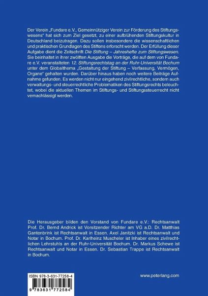 Der Verein "Fundare e.V., Gemeinnütziger Verein zur Förderung des Stiftungswesens" hat sich zum Ziel gesetzt, zu einer aufblühenden Stiftungskultur in Deutschland beizutragen. Dazu sollen insbesondere die wissenschaftlichen und praktischen Grundlagen des Stiftens erforscht werden. Der Erfüllung dieser Aufgabe dient die Zeitschrift Die Stiftung - Jahreshefte zum Stiftungswesen. Sie beinhaltet in ihrer zwölften Ausgabe die Vorträge, die auf dem von Fundare e.V. veranstalteten 12. Stiftungsrechtstag an der Ruhr-Universität Bochum unter dem Globalthema "Gestaltung der Stiftung - Verfassung, Vermögen, Organe" gehalten wurden. Darüber hinaus haben noch weitere Beiträge Aufnahme gefunden. Es werden nicht nur eingehend zivilrechtliche, sondern auch verwaltungs- und steuerrechtliche Problematiken des Stiftungsrechts beleuchtet, wobei die aktuellen Themen im Stiftungs- und Stiftungssteuerrecht nicht vernachlässigt werden.