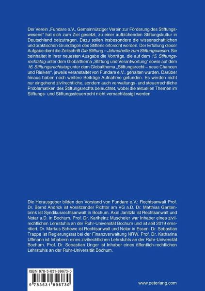 Der Verein "Fundare e.V., Gemeinnütziger Verein zur Förderung des Stiftungswesens" hat sich zum Ziel gesetzt, zu einer aufblühenden Stiftungskultur in Deutschland beizutragen. Dazu sollen insbesondere die wissenschaftlichen und praktischen Grundlagen des Stiftens erforscht werden. Der Erfüllung dieser Aufgabe dient die Zeitschrift Die Stiftung - Jahreshefte zum Stiftungswesen. Sie beinhaltet in ihrer neuesten Ausgabe die Vorträge, die auf dem 15. Stiftungsrechtstag unter dem Globalthema "Stiftung und Verantwortung" sowie auf dem 16. Stiftungsrechtstag unter dem Globalthema "Stiftungsrecht - neue Chancen und Risiken", jeweils veranstaltet von Fundare e.V., gehalten wurden. Darüber hinaus haben noch weitere Beiträge Aufnahme gefunden. Es werden nicht nur eingehend zivilrechtliche, sondern auch verwaltungs- und steuerrechtliche Problematiken des Stiftungsrechts beleuchtet, wobei die aktuellen Themen im Stiftungs- und Stiftungssteuerrecht nicht vernachlässigt werden.