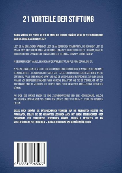 Die Stiftungsholding Teil II - 21 Vorteil der Stiftung Warum wird in der Praxis so oft die GmbH als Holding gewählt, wenn die Stiftungsholding doch die bessere Alternative ist? Liegt es am einfacheren Handling? Liegt es am geringeren Stammkapital bei der GmbH? Liegt es daran, dass ihr Steuerberater mit der GmbH einfach vertrauter ist? Liegt es daran, dass Sie bisher noch nichts von der Stiftung als mögliche Holding-Alternative gehört haben? In diesem Buch geht Manuel Blocher auf die Familienstiftung als Form der Holding ein. In 21 Punkten wurden die Vorteile der Stiftungsholding gegenüber der klassischen Holding-GmbH herausgearbeitet. Es wird aus deutscher Sicht (steuerlich und rechtlich) beschrieben, wie die Stiftung im Falle einer Holding wirkt und wo die wesentlichen Unterschiede zur GmbH liegen. Anhand von Beispielberechnungen wird im Detail erläutert, wie Sie die Steuerlast mit der Stiftungsholding im Vergleich zur derzeit noch öfter genutzten GmbH-Holding reduzieren können. Am Ende des Buches finden Sie eine Zusammenfassung und eine Hochrechnung, welche steuerlichen Einsparungen sich durch den Einsatz einer Stiftung im 1:1 Vergleich erwirken lassen. Dieses Buch enthält die entsprechenden Verweise auf die relevanten Gesetze und Paragrafen, sodass Sie die genannten Lösungen auch mit ihrem Steuerberater oder Fachanwalt für Steuerrecht besprechen können. Ebenfalls enthalten ist ein Musterformular zur Einnahmen- / Ausgabenrechnung und Vermögensübersicht.