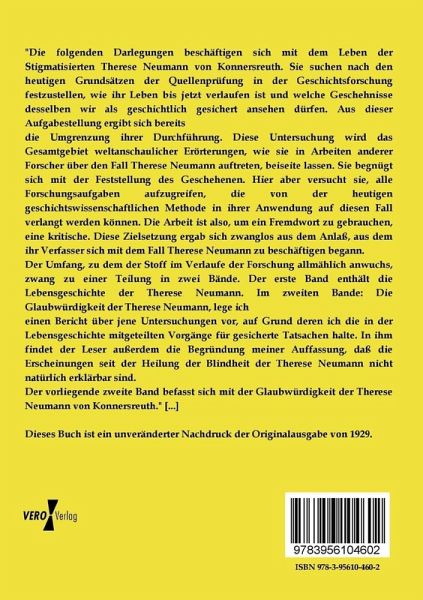 "Die folgenden Darlegungen beschäftigen sich mit dem Leben der Stigmatisierten Therese Neumann von Konnersreuth. Sie suchen nach den heutigen Grundsätzen der Quellenprüfung in der Geschichtsforschung festzustellen, wie ihr Leben bis jetzt verlaufen ist und welche Geschehnisse desselben wir als geschichtlich gesichert ansehen dürfen. Aus dieser Aufgabestellung ergibt sich bereits die Umgrenzung ihrer Durchführung. Diese Untersuchung wird das Gesamtgebiet weltanschaulicher Erörterungen, wie sie in Arbeiten anderer Forscher über den Fall Therese Neumann auftreten, beiseite lassen. Sie begnügt sich mit der Feststellung des Geschehenen. Hier aber versucht sie, alle Forschungsaufgaben aufzugreifen, die von der heutigen geschichtswissenschaftlichen Methode in ihrer Anwendung auf diesen Fall verlangt werden können. Die Arbeit ist also, um ein Fremdwort zu gebrauchen, eine kritische. Diese Zielsetzung ergab sich zwanglos aus dem Anlaß, aus dem ihr Verfasser sich mit dem Fall Therese Neumann zu beschäftigen begann. Der Umfang, zu dem der Stoff im Verlaufe der Forschung allmählich anwuchs, zwang zu einer Teilung in zwei Bände. Der erste Band enthält die Lebensgeschichte der Therese Neumann. Im zweiten Bande: Die Glaubwürdigkeit der Therese Neumann, lege ich einen Bericht über jene Untersuchungen vor, auf Grund deren ich die in der Lebensgeschichte mitgeteilten Vorgänge für gesicherte Tatsachen halte. In ihm findet der Leser außerdem die Begründung meiner Auffassung, daß die Erscheinungen seit der Heilung der Blindheit der Therese Neumann nicht natürlich erklärbar sind. Der vorliegende zweite Band befasst sich mit der Glaubwürdigkeit der Therese Neumann von Konnersreuth." [...] Dieses Buch ist ein unveränderter Nachdruck der Originalausgabe von 1929.