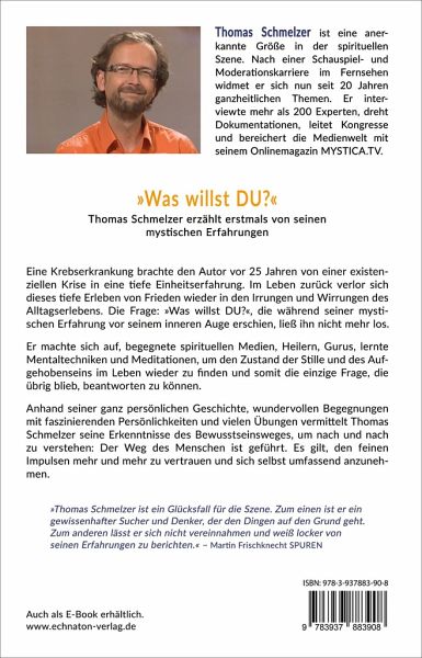 "Was willst DU?" - Thomas Schmelzer, Moderator von MYSTICA.TV, erzählt erstmals von seinen mystischen Erfahrungen. Eine Krebserkrankung brachte den Autor vor 25 Jahren von einer existenziellen Krise in eine tiefe Einheitserfahrung. Im Leben zurück verlor sich dieses tiefe Erleben von Frieden wieder in den Irrungen und Wirrungen des Alltagserlebens. Die Frage: "Was willst DU?", die während seiner mystischen Erfahrung vor seinem inneren Auge erschien, ließ ihn nicht mehr los. Er machte sich auf, begegnete spirituellen Medien, Heilern, Gurus, lernte Mentaltechniken und Meditationen, um den Zustand der Stille und des Aufgehobenseins im Leben wieder zu finden und somit die einzige Frage, die übrig blieb, beantworten zu können.Anhand seiner ganz persönlichen Geschichte, wundervollen Begegnungen mit faszinierenden Persönlichkeiten und vielen Übungen vermittelt Thomas Schmelzer seine Erkenntnisse des Bewusstseinsweges, um nach und nach zu verstehen: Der Weg des Menschen ist geführt. Es gilt, den feinen Impulsen mehr und mehr zu vertrauen und sich selbst umfassend anzunehmen.