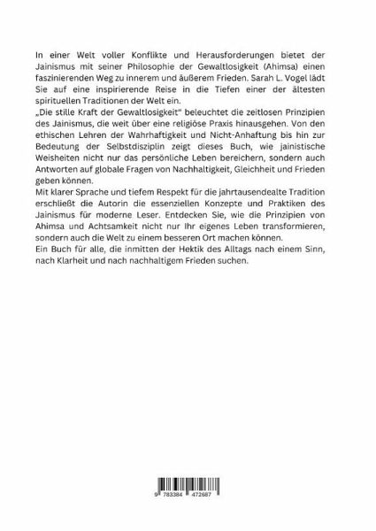 In einer Welt voller Konflikte und Herausforderungen bietet der Jainismus mit seiner Philosophie der Gewaltlosigkeit (Ahimsa) einen faszinierenden Weg zu innerem und äußerem Frieden. Sarah L. Vogel lädt Sie auf eine inspirierende Reise in die Tiefen einer der ältesten spirituellen Traditionen der Welt ein."Die stille Kraft der Gewaltlosigkeit" beleuchtet die zeitlosen Prinzipien des Jainismus, die weit über eine religiöse Praxis hinausgehen. Von den ethischen Lehren der Wahrhaftigkeit und Nicht-Anhaftung bis hin zur Bedeutung der Selbstdisziplin zeigt dieses Buch, wie jainistische Weisheiten nicht nur das persönliche Leben bereichern, sondern auch Antworten auf globale Fragen von Nachhaltigkeit, Gleichheit und Frieden geben können.Mit klarer Sprache und tiefem Respekt für die jahrtausendealte Tradition erschließt die Autorin die essenziellen Konzepte und Praktiken des Jainismus für moderne Leser. Entdecken Sie, wie die Prinzipien von Ahimsa und Achtsamkeit nicht nur Ihr eigenes Leben transformieren, sondern auch die Welt zu einem besseren Ort machen können.Ein Buch für alle, die inmitten der Hektik des Alltags nach einem Sinn, nach Klarheit und nach nachhaltigem Frieden suchen.