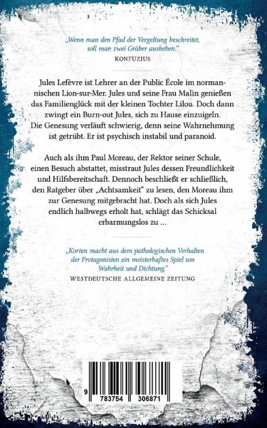 "Wenn man den Pfad der Vergeltung beschreitet, soll man zwei Gräber ausheben." KonfuziusJules Lefevre ist Lehrer an der Public Ecole im normannischen Lion-sur-Mer. Jules und seine Frau Malin genießen das Familienglück mit der kleinen Tochter Lilou. Doch dann zwingt ein Burn-out Jules, sich zu Hause einzuigeln. Die Genesung verläuft schwierig, denn seine Wahrnehmung ist getrübt. Er ist psychisch instabil und paranoid.Auch als ihm Paul Moreau, der Rektor seiner Schule, einen Besuch abstattet, misstraut Jules dessen Freundlichkeit und Hilfsbereitschaft. Dennoch beschließt er schließlich, den Ratgeber über Achtsamkeit zu lesen, den Moreau ihm zur Genesung mitgebracht hat. Doch als sich Jules endlich halbwegs erholt hat, schlägt das Schicksal erbarmungslos zu."Korten macht aus dem pathologischen Verhalten der Protagonisten ein meisterhaftes Spiel um Wahrheit und Dichtung."Westdeutsche Allgemeine Zeitung