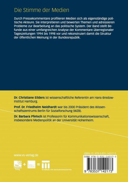 Dr. Christiane Eilders ist wissenschaftliche Referentin am Hans-Bredow-Institut Hamburg. Prof. Dr. Friedhelm Neidhardt war bis 2000 Präsident des Wissenschaftszentrums Berlin für Sozialforschung (WZB). Dr. Barbara Pfetsch ist Professorin für Kommunikationswissenschaft, insbesondere Medienpolitik an der Universität Hohenheim.