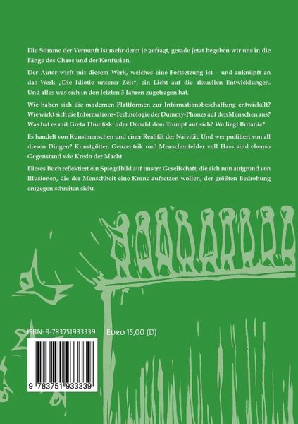 Die Stimme der Vernunft konfrontiert eine Gesellschaft der absoluten Destruktivität und des Wahnsinns. Transportable Minicomputer haben es geschafft den Menschen komplett zu vereinnahmen. Wie aus dem genormten Menschen des 20. Jahrhunderts, der Kunstmensch des 21. Jahrhundert entstanden ist. Und dieses ist nur eine Brücke die gegangen werden muss, um aus dem Menschen etwas völlig unmenschliches zu Formen. Eine Apparatur die nicht mehr aus Fleisch, Blut und Zellen besteht sondern eine Nanotechnologische Maschine, die von dritten bedient werden kann, wie ein Objekt. Es gilt der Gesellschaft einen Spiegel vorzuhalten, vor dieser Projektion der gesunde Menschenverstand nur zurückschrecken kann. In diesem Werk werden die Trends, der letzten Jahre beleuchtet. Wie der künstliche, nicht mehr natürliche Mensch erschaffen wurde und weiter geformt wird. Wie werden Kunstgötter erschaffen und das Weltbild des Menschen manipuliert. Wie wird Realitätskontrolle betrieben von Sozial-Ingenieuren. Abschließend eine Zusammenfassung der Ereignisse um die Corona Krise in 2020, geschildert aus der Perspektive des Autors. Dessen Zusammenfassung diese Krise als absolute Farce outen dürfte. Aufzeigt, dass diese Krise genutzt wurde um gewissen Zwecken die Mittel zu heiligen. Die Idiotie unserer Zeit versus die Stimme der Vernunft.