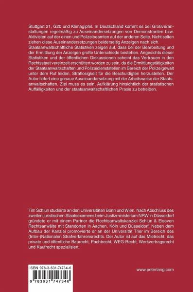 Staatsanwaltschaftliche Statistiken zeigen auf, dass bei der Bearbeitung und der Ermittlung der Anzeigen große Unterschiede bestehen. Angesichts dieser Statistiken und der öffentlichen Diskussionen scheint das Vertrauen in den Rechtsstaat vereinzelt erschüttert worden zu sein, da die Ermittlungstätigkeiten der Staatsanwaltschaften und Polizeidienststellen im Bereich der Polizeigewalt unter dem Ruf leiden, Straflosigkeit für die Beschuldigten herzustellen. Der Autor liefert eine genaue Auseinandersetzung mit der Arbeitsweise der Staatsanwaltschaften. Ziel muss es sein, Aufklärung hinsichtlich der statistischen Auffälligkeiten und der staatsanwaltschaftlichen Praxis zu betreiben.
