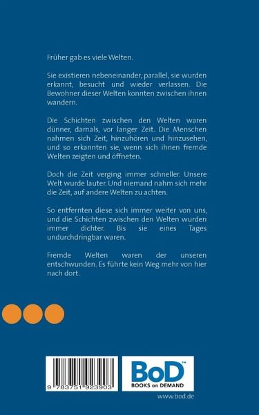 Früher gab es viele Welten.Sie existierten nebeneinander, parallel, sie wurden erkannt, besucht und wieder verlassen. Die Bewohner dieser Welten konnten zwischen ihnen wandern.Die Schichten zwischen den Welten waren dünner, damals, vor langer Zeit. Die Menschen nahmen sich Zeit, hinzuhören und hinzusehen, und so erkannten sie, wenn sich ihnen fremde Welten zeigten und öffneten.Doch die Zeit verging immer schneller. Unsere Welt wurde lauter. Und niemand nahm sich mehr die Zeit, auf andere Welten zu achten.So entfernten diese sich immer weiter von uns, und die Schichten zwischen den Welten wurden immer dichter. Bis sie eines Tages undurchdringbar waren.Fremde Welten waren der unseren entschwunden. Es führte kein Weg mehr von hier nach dort.Bis heute!