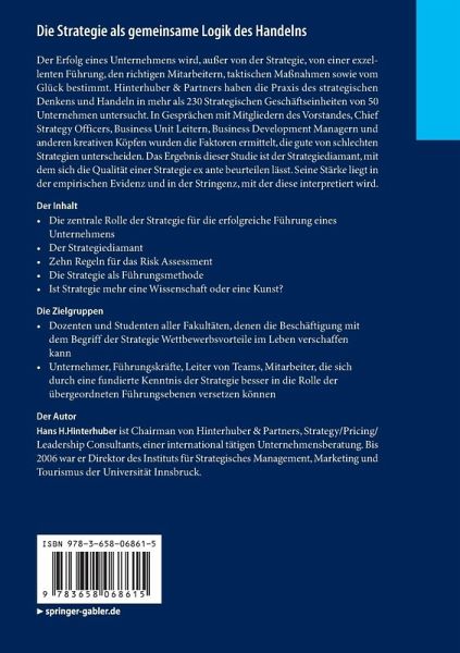 Der Erfolg eines Unternehmens wird, außer von der Strategie, von einer exzellenten Führung, den richtigen Mitarbeitern, taktischen Maßnahmen sowie vom Glück bestimmt. Hinterhuber & Partners haben die Praxis des strategischen Denkens und Handeln in mehr als 230 Strategischen Geschäftseinheiten von 50 Unternehmen untersucht. In Gesprächen mit Mitgliedern des Vorstandes, Chief Strategy Officers, Business Unit Leitern, Business Development Managern und anderen kreativen Köpfen wurden die Faktoren ermittelt, die gute von schlechten Strategien unterscheiden. Das Ergebnis dieser Studie ist der Strategiediamant, mit dem sich die Qualität einer Strategie ex ante beurteilen lässt. Seine Stärke liegt in der empirischen Evidenz und in der Stringenz, mit der diese interpretiert wird.