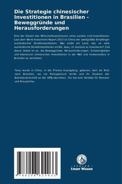 Eine der Säulen des Wirtschaftswachstums eines Landes sind Investitionen. Laut dem World Investment Report 2013 ist China der zweitgrößte Empfänger ausländischer Direktinvestitionen. Was treibt ein Land, das so viele ausländische Direktinvestitionen erhält, dazu, im Ausland zu investieren? Ziel dieser Arbeit ist es, die Beweggründe, Herausforderungen, Schwierigkeiten und Interessen chinesischer Investitionen in der Welt und insbesondere in Brasilien zu verstehen.