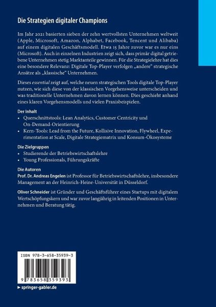 Im Jahr 2021 basierten sieben der zehn wertvollsten Unternehmen weltweit (Apple, Microsoft, Amazon, Alphabet, Facebook, Tencent und Alibaba) auf einem digitalen Geschäftsmodell. Etwa 15 Jahre zuvor war es nur eins (Microsoft). Auch in einzelnen Industrien zeigt sich, dass primär digital getriebene Unternehmen stetig Marktanteile gewinnen. Für die Strategielehre hat dies eine besondere Relevanz: Digitale Top-Player verfolgen "andere" strategische Ansätze als "klassische" Unternehmen. Dieses essential zeigt auf, welche neuen strategischen Tools digitale Top-Player nutzen, wie sich diese von der klassischen Vorgehensweise unterscheiden und was traditionelle Unternehmen davon lernen können. Dies geschieht anhand eines klaren Vorgehensmodells und vielen Praxisbeispielen.