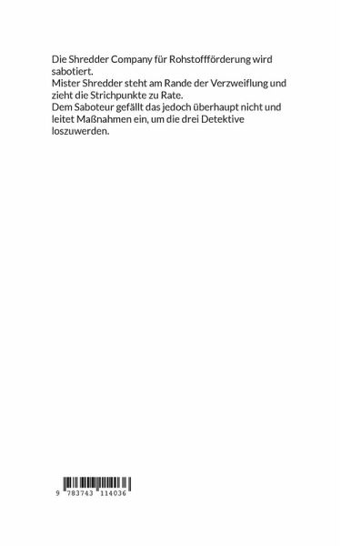 Die Shredder Company für Rohstoffförderung wird sabotiert. Mister Shredder steht am Rande der Verzweiflung und zieht die Strichpunkte zu Rate. Dem Saboteur gefällt das jedoch überhaupt nicht und leitet Maßnahmen ein, um die drei Detektive loszuwerden.