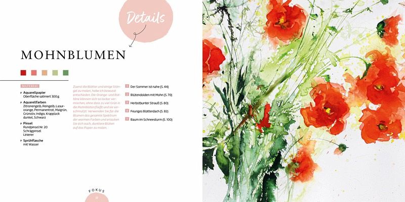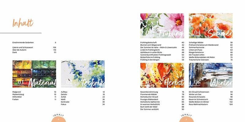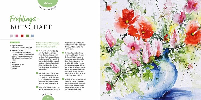 Neue und klassische Techniken für Aquarell: Das Buch bietet den idealen Einstieg in die Aquarellmalerei und liefert zugleich zahlreiche Inspirationen für fortgeschrittene Aquarellisten. Die Motive spiegeln einen Streifzug durch die Jahreszeiten und beeindrucken durch ihre Filigranität und Leuchtkraft. Struktureffekte, Untergründe, spannende Farbharmonien und vieles mehrAlle Grundlagen zum Material, Step-Motive und Tipps vom ProfiFür den idealen Einstieg in die Aquarellmalerei und zur Erweiterung der technischen Fertigkeitenzahlreiche Kreativimpulse