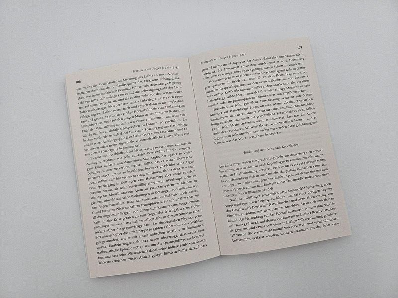 Zur Vorsicht Gruppenbild mit Dame Zehn Schritte durch die Zeit 1 Weltstars in Berlin (1900-1919) 2 Frühling in Kopenhagen (1912-1920) 3 Zwei Wunderknaben in München (1920/21) 4 Festspiele mit Folgen (1922-1924) 5 Zweideutigkeiten (1923/24) 6 Zur Schönheit in der Nacht (1925) 7 Ferien in Arosa (1926/27) 8 Das Ringen im Norden (1927/28) 9 Zwei seltsame Herren (1928/29) 10 Faust in Kopenhagen (1932) Nachleben 1 Die schlimmen Jahre: Der Verlust der Unschuld und der Sprache Nachleben 2 Die Verschränkung und ein Kinderspiel Nachleben 3 Molekularbiologie im Informationszeitalter Epilog: Der beleidigte gesunde Menschenverstand Anhang Literatur Kurzbiographien Glossar Chronik Danksagung Bildnachweis Personenregister